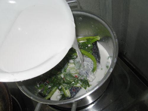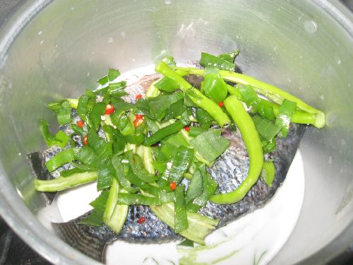After which I pour on varied and sundry greenery, including 2 pieces labuyo. There’s longer green pepper, chives and other greens, and later on I add carrots and onions in there.