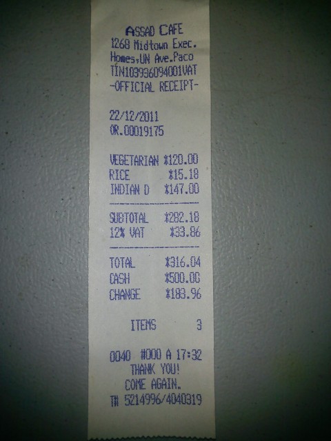 Overall we spent P316.00, a perfectly reasonable sum for the excellent (and I seldom use that word) meal we had. You won’t be able to tell that from their receipt however, which lists different items but had the same total nonetheless. We didn’t order anything ‘vegetarian’.