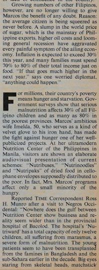 For millions, their country’s poverty means hunger and starvation. Government surveys show that serious malnutrition affects 30% of all Filipino children and as many as 80% in the poorest provinces. Marcos’ ambitious wife Imelda, 50, who serves as a king of velvet glove to his iron hand, has made the fight against hunger one of her well publicized projects. At her ultramodern Nutrition Center of the Philippines in Manila, visitors are shown an elaborate audiovisial presentation of current schemes: ‘Nutribuses,’, ‘Nutrinoodles’ and ‘Nutripaks’ of dried food in cellophane envelopes supposedly distributed to the poor. In fact, Mrs. Marcos programs affect only a small minority of the hungry.