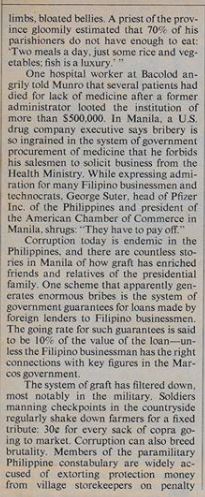 One hospital worker at Bacolod angrily told Munro that several patients had dies for lack of medicine after a former administrator looted the institution of more than $500,000. In Manila, a US drug company executive says bribery is so ingrained in the system of government procurement of medicine that he forbids his salesmen to solicit business from the Health Ministry. While expressing admiration for many Filipino businessmen and technocrats, George Suter, head of Pfizer Inc. of the Philippines and president of the American Chamber of Commerce in Manila, shrugs: ‘They have to pay off.’