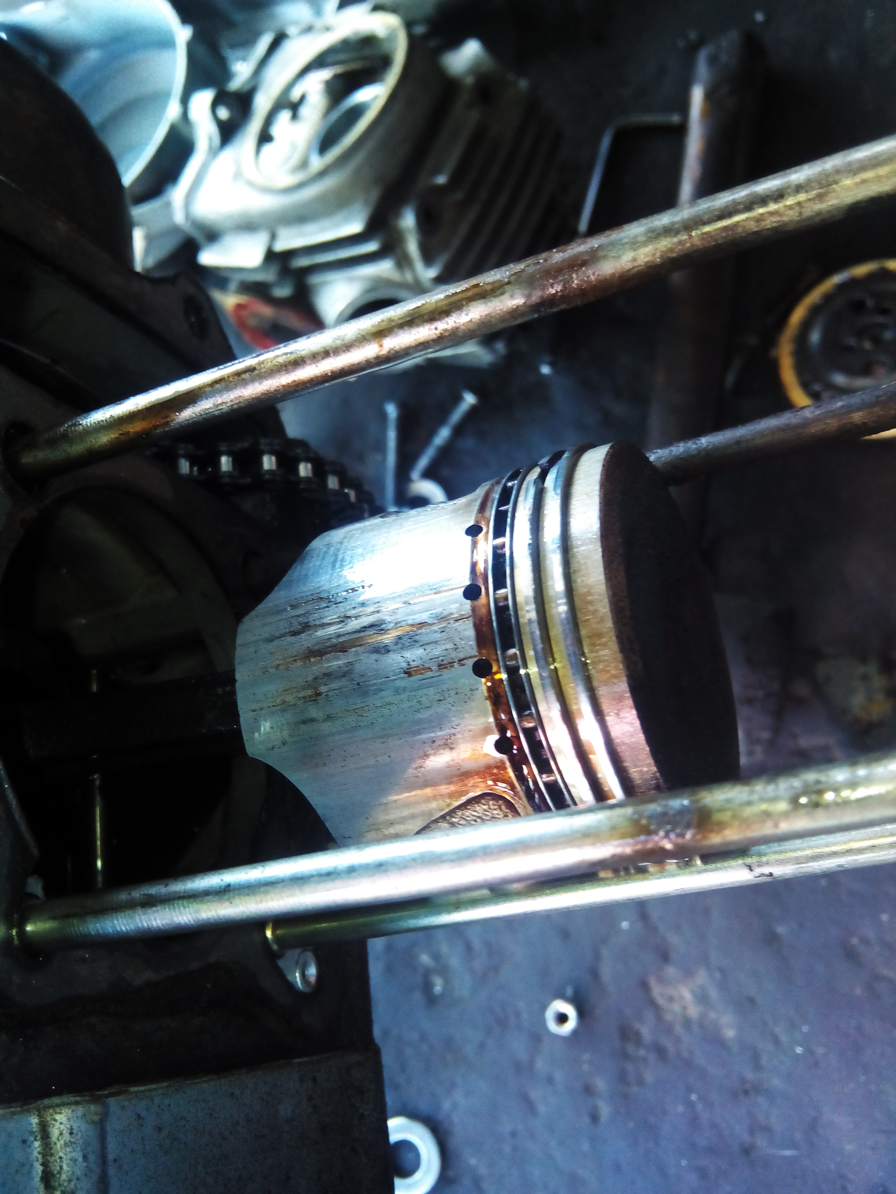 My mechanic confirmed what I suspected which was that Leslie’s engine was eating oil. I could here the rocker arms clicking louder than usual indicating that oil wasn’t getting to it and it was also spewing out white smoke like a 2 stroke. A top overhaul was necessary so that meant a new piston, piston rings and valve seals (the valves were still ok). The piston below showed the worst of it, streaks of metal hitting metal.
